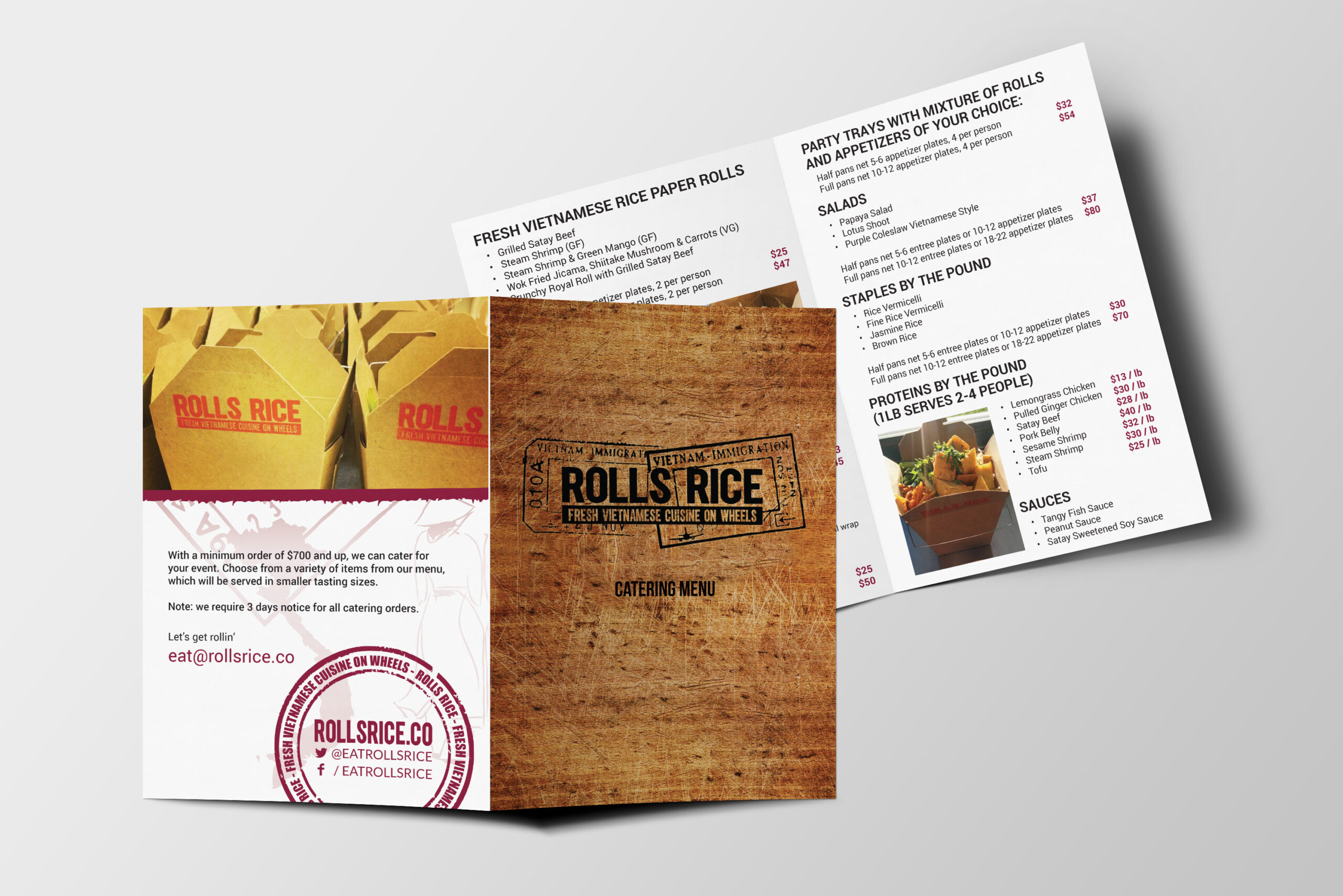 Catering menu layout, and sandwich board for Calgary food truck, Rolls Rice.